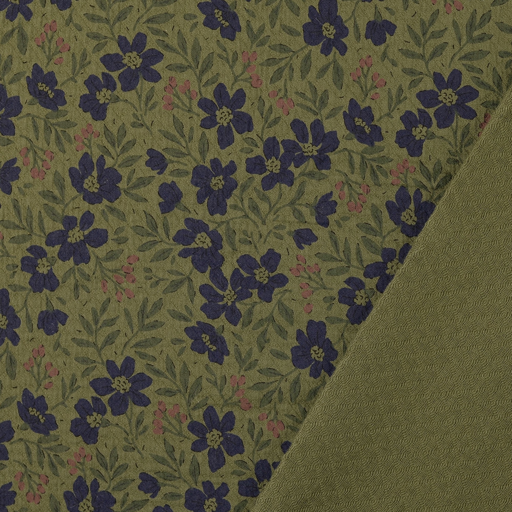 En alldeles ny kvalitet där stentvättad bomullsväv möter en klassisk jaquardväv. Resultatet blir en tvåsidig fantastiskt trevlig historia. Rätsidan är blommig (största blomman är ca 3cm) och ”avigan” är enfärgad med en vacker struktur. Går utmärkt att kombinera – perfekt matchning! Känns mjuk och skön, med lite mer kropp än i vanliga bomullstyger. Gör sig lika bra i necessären, som i skjortan, som i kjolen, som i gardinen, som i örngottet, som i, ja, du förstår, den passar till lite utav varje.