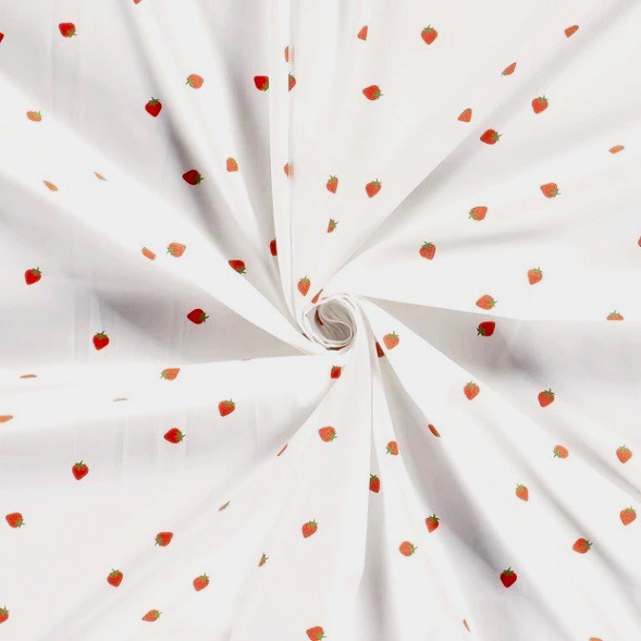 Fem om da´n gör kroppen glad! Men bara en jordgubbe (ca 1cm stort) om dagen är inte så dumt det heller. En härlig bomullspoplin (=tätvävd). Gör sig lika bra i babynestet, som i skjortan, som i kjolen, som i gardinen, som i örngottet, som i, ja, du förstår, den passar till lite utav varje.
