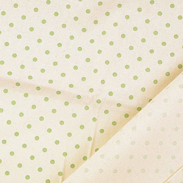 En högkvalitativ (cretonne) och härlig bomullsväv med klassiska prickar på en fröskalsbotten. Pricken är 6mm. Det som gör det här trycket lite speciellt är att det är en sk wash out dvs. det får en lite sliten vintage-look efter tvätt. Gör sig lika bra i skjortan, kjolen, gardinen, örngottet, duken, ja, du förstår, den passar till lite utav varje.