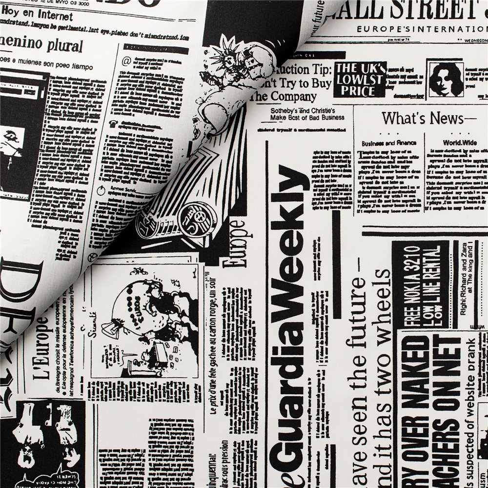Om du behöver en nyhetstidning, men inte står ut med pappersprasslet eller läsplatte-ljuset – här har du tyget för dig. Grafiskt med rubriker på italienska och engelska. Frihetsgudinnan är ca 10 cm hög, rutan med serier knappt 9 cm.
