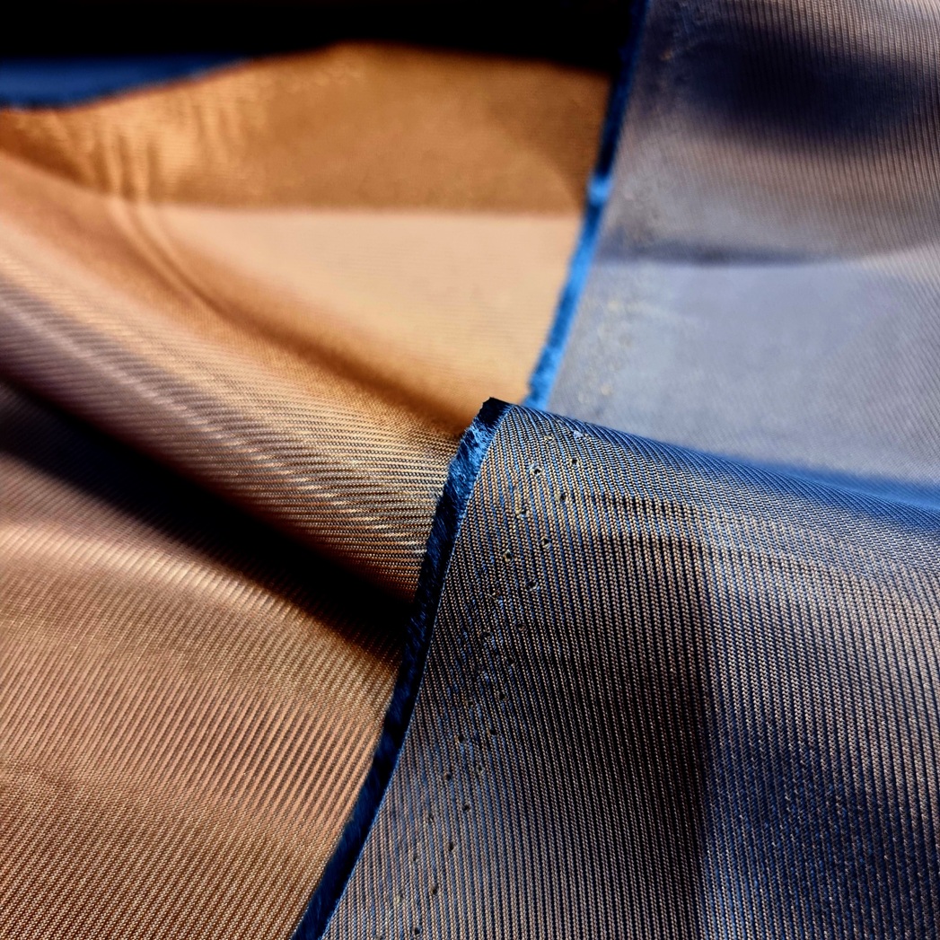 Det här är ett tunt och lätt fodertyg i viskos och acetat. Det har diagonala linjer som skimrar i två olika färger beroende på ljuset. Den ena sidan har den mörkare färgen som huvudfärg med smala linjer i den ljusa färgen, och den andra sidan har ljust och mörkt i omvänd ordning. Det går alltså lika bra att använda båda sidorna; det har ingen tydlig räta eller aviga.