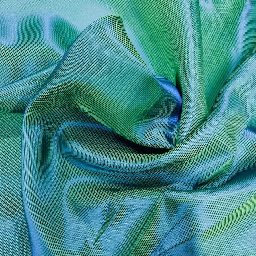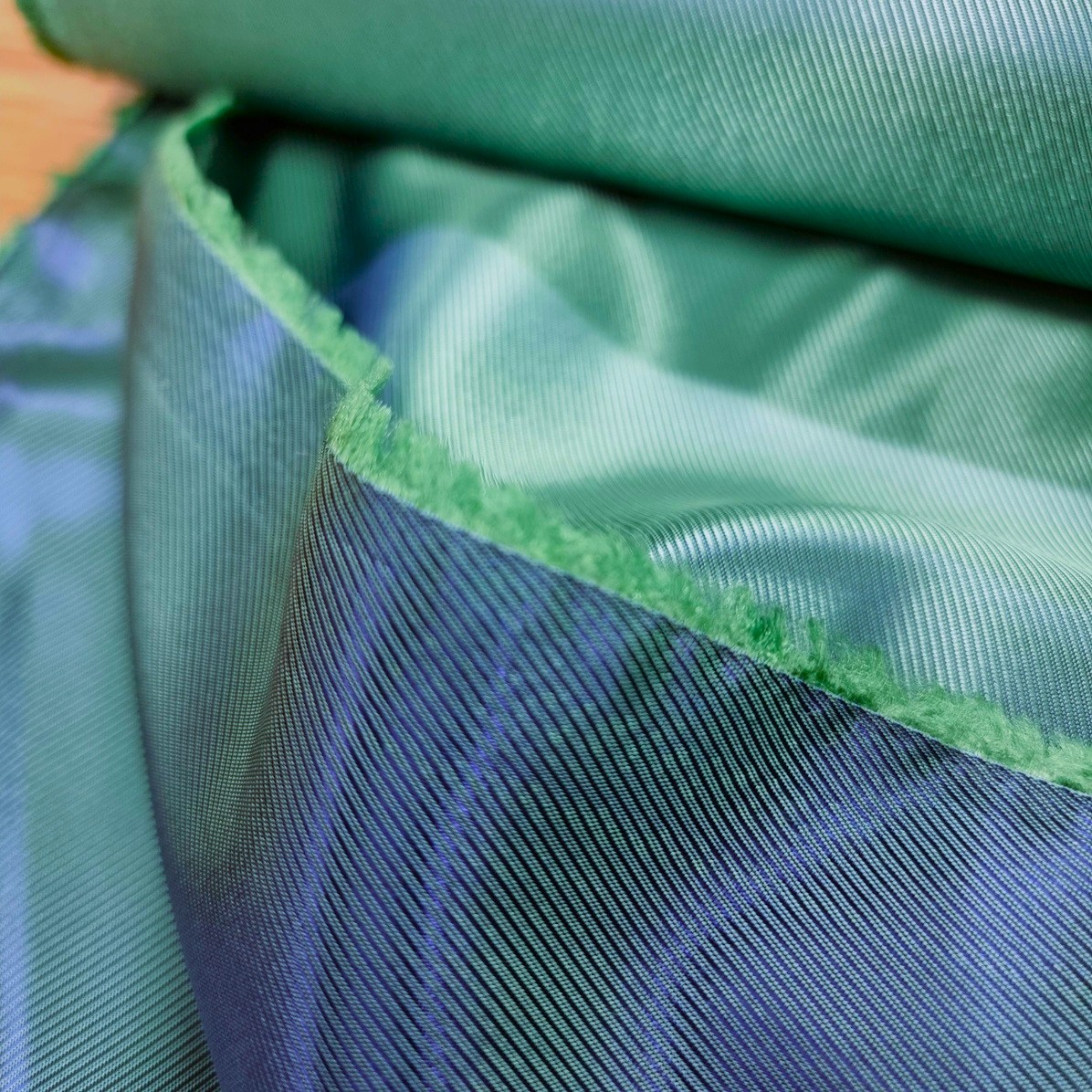 Det här är ett tunt och lätt fodertyg i viskos och acetat. Det har diagonala linjer som skimrar i två olika färger beroende på ljuset. Den ena sidan har den mörkare färgen som huvudfärg med smala linjer i den ljusa färgen, och den andra sidan har ljust och mörkt i omvänd ordning. Det går alltså lika bra att använda båda sidorna; det har ingen tydlig räta eller aviga.