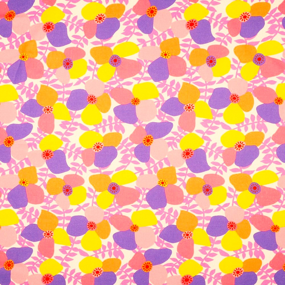 Wohoo! Så glad blir man faktiskt av det här tyget. Storblommigt och färgglatt, ibland är det just precis vad en behöver i livet. Blommorna är på bredaste stället 11cm. Förutom att vara fint så har det även ett vackert fall samt, är oerhört behagligt. Dröm om skjortan, tunikan, vida brallan, kjolen, klänningen, gardinen, duken etc.